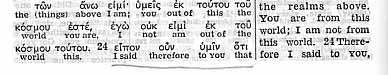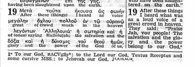 The NWT column reads (The same in both purple and blue editions.) Read carefully the words under the Greek text... "This but is the everlasting life in order that they may be knowing you the only true God and whom you sent forth Jesus Christ." Did you spot the critical difference? The NWT says "taking in knowledge of you" BUT the Greek text in the KIT says something quite different..."they may be knowing you." We need to know God through Jesus Christ in order to have everlasting life. All the knowledge in the world will not save us. Yet the Watchtower Society, by altering the scripture here accomplishes two things in its own self-interest. First, since they dispense "knowledge" through the printed page, it follows that they want their people to be forever "taking in knowledge". Thus the distortion to fit their preconceived ideas. Secondly, they do not want their followers seeking after a relationship with Christ, but dependent instead on their organization. They have therefore dispensed with Christ being the mediator for their followers with the earthly hope, and have substituted their organization in direct violation of 1 Timothy 2:5. We hardly think this course of action would please the "Divine Judge" they claim to be pleasing with their "translation" of His Holy Word!