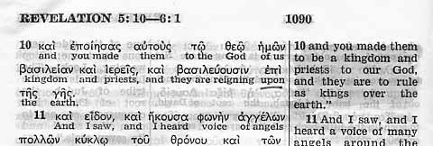 Rev 5:10 (09) In the Greek text we find this group reigning UPON the earth, but by the time the "translation" makes it to the NWT side of the page, suddenly they are reigning OVER the earth, not UPON it! How come in other places they left the word "upon" as it was? (Rev. 5:13 etc. etc.) It takes another Greek word entirely to mean "OVER". Why the blatant deception? Well, they can't have the "anointed class" (made up of the 144,000) upon earth when they teach that they are the only ones in heaven, and it is the OTHER, lower class that must remain on earth. So, once again, we find the Watchtower's peculiar doctrines being given precedence over the Word of God, and the Society changing God's word to accommodate their doctrines!